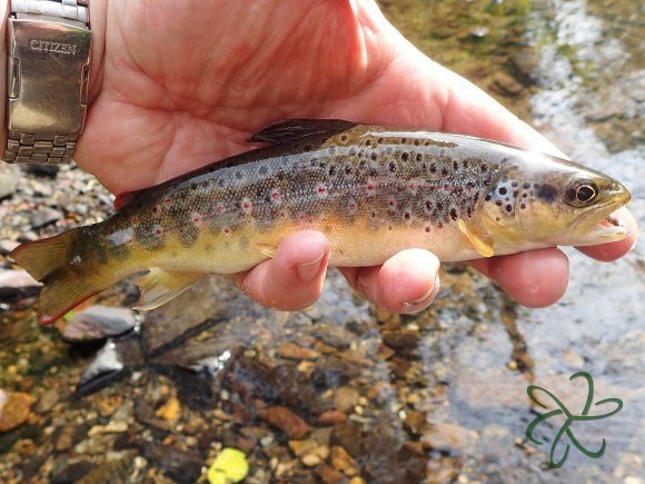 I saw a rise on a bend, under a tree. The water had cut a deep channel under the bank and with some tricky casting I got the fly in close to the nearside bank without snagging. I couldn't see the fly line entering the water but the BMS Azayaka has blocks of colour. I used the next block up from the one at the end as an indicator. The line stabbed. I twitched the rod and a fish was on.
